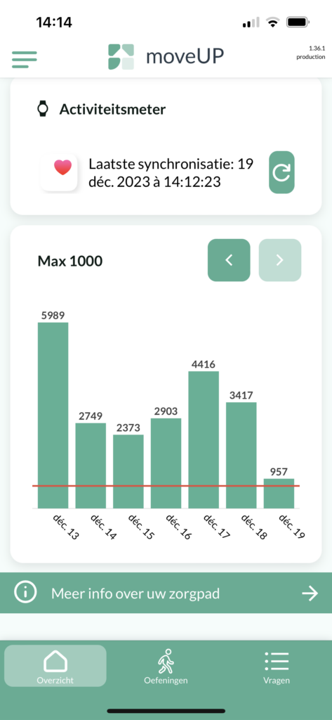 Scroll op de hoofdpagina van moveUP (Overzicht) naar beneden naar “Activiteitsmeter” en klik op “Registreer uw activiteitsmeter om uw stappen te synchroniseren”.
