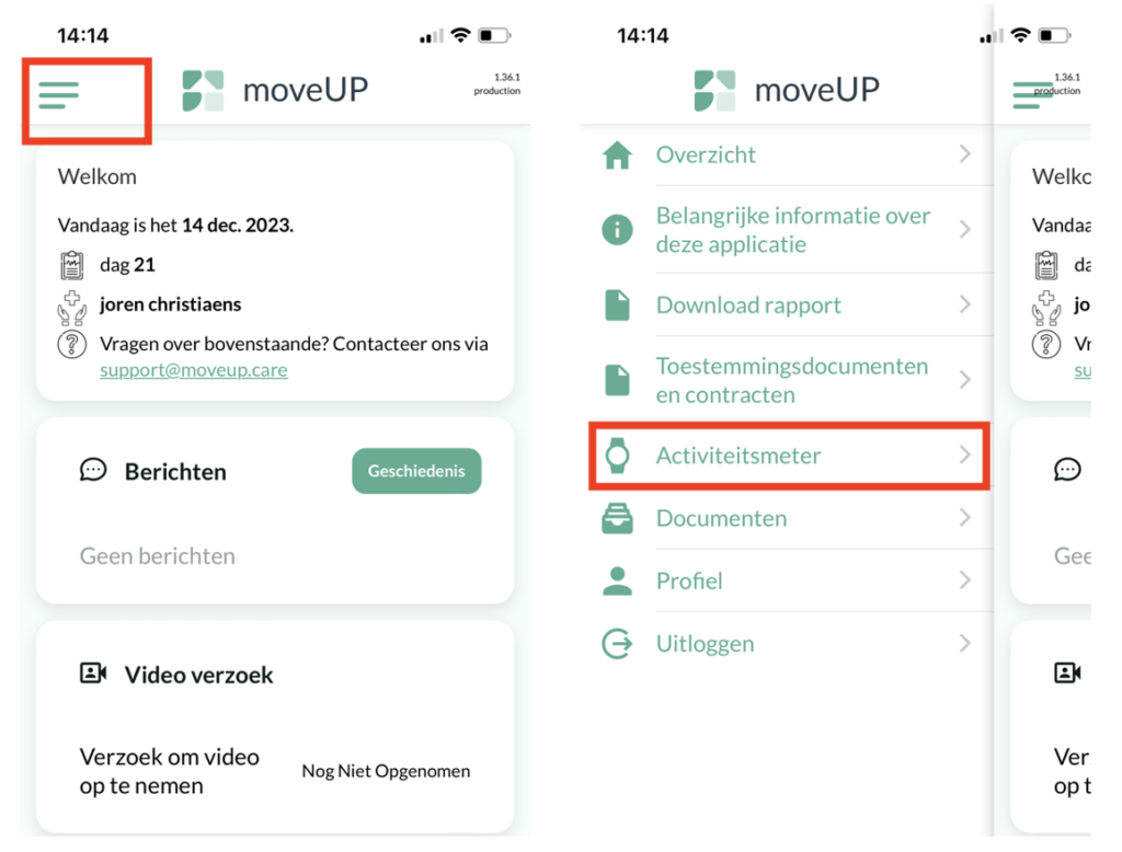 Om uw activiteitsmeter te koppelen klikt u op de knop “Menu” linksboven op het scherm. Kies vervolgens “Activiteitsmeter” uit de menulijst.
